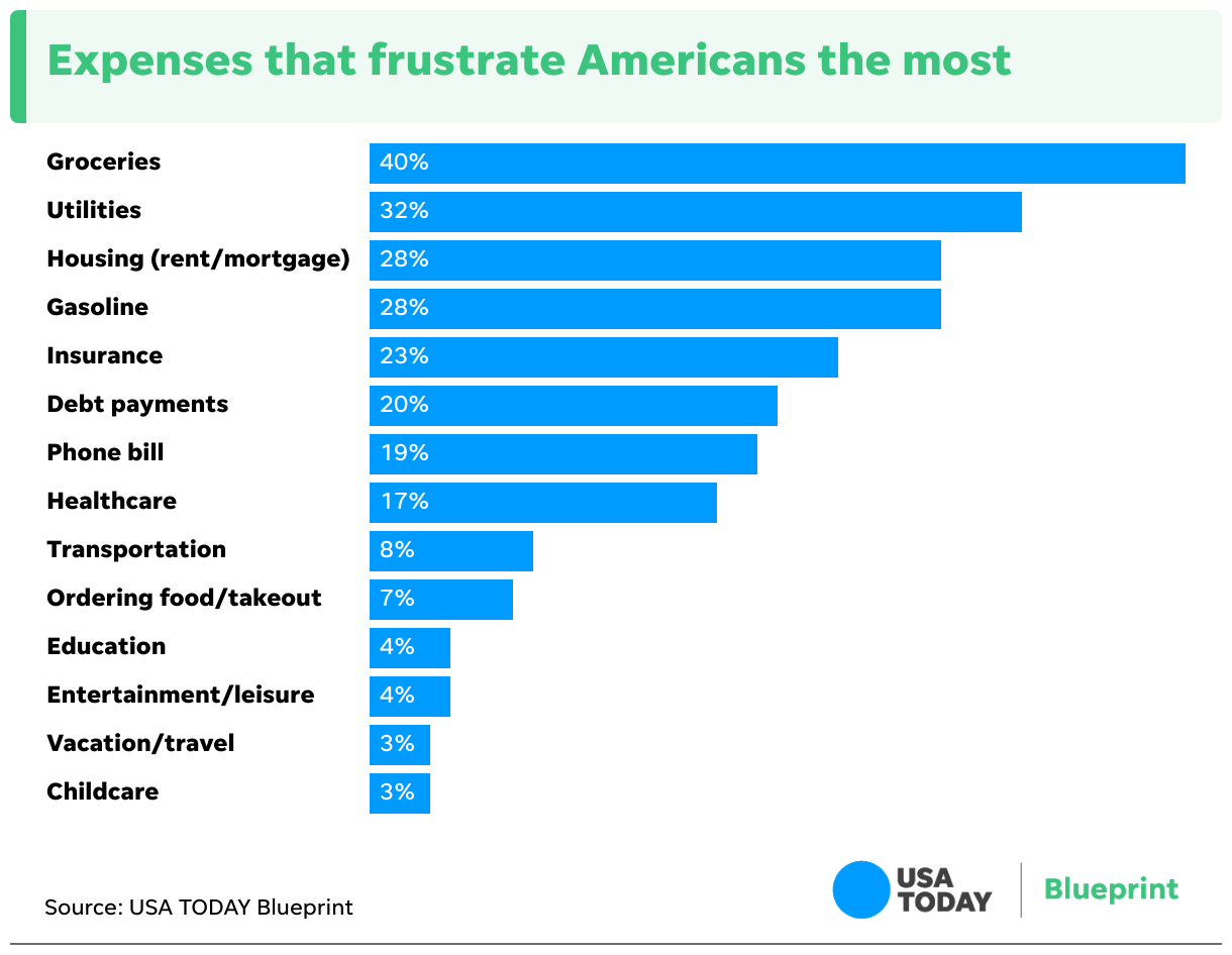- Grocery bills frustrate Americans more than any other regular expense. Utilities, rent/mortgage payments, gasoline and insurance payments round out the top five most annoying expenses.